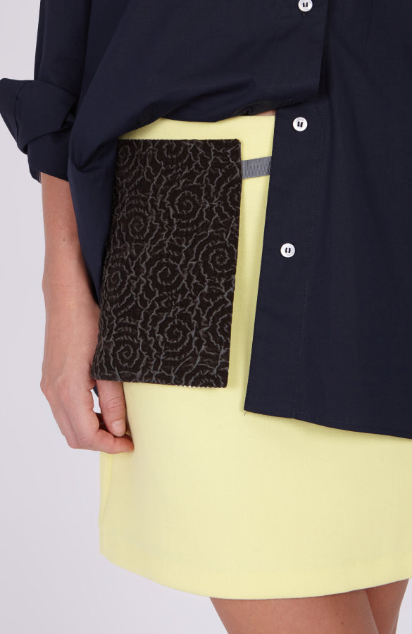 Minigonna ad A gialla, lunghezza a metà coscia, con zip invisibile sul fianco. La gonna è accessoriata e venduta insieme ad una tasca decorativa in tessuto jacquard come in foto, removibile e legabile in vita tramite una fettuccia abbinata.